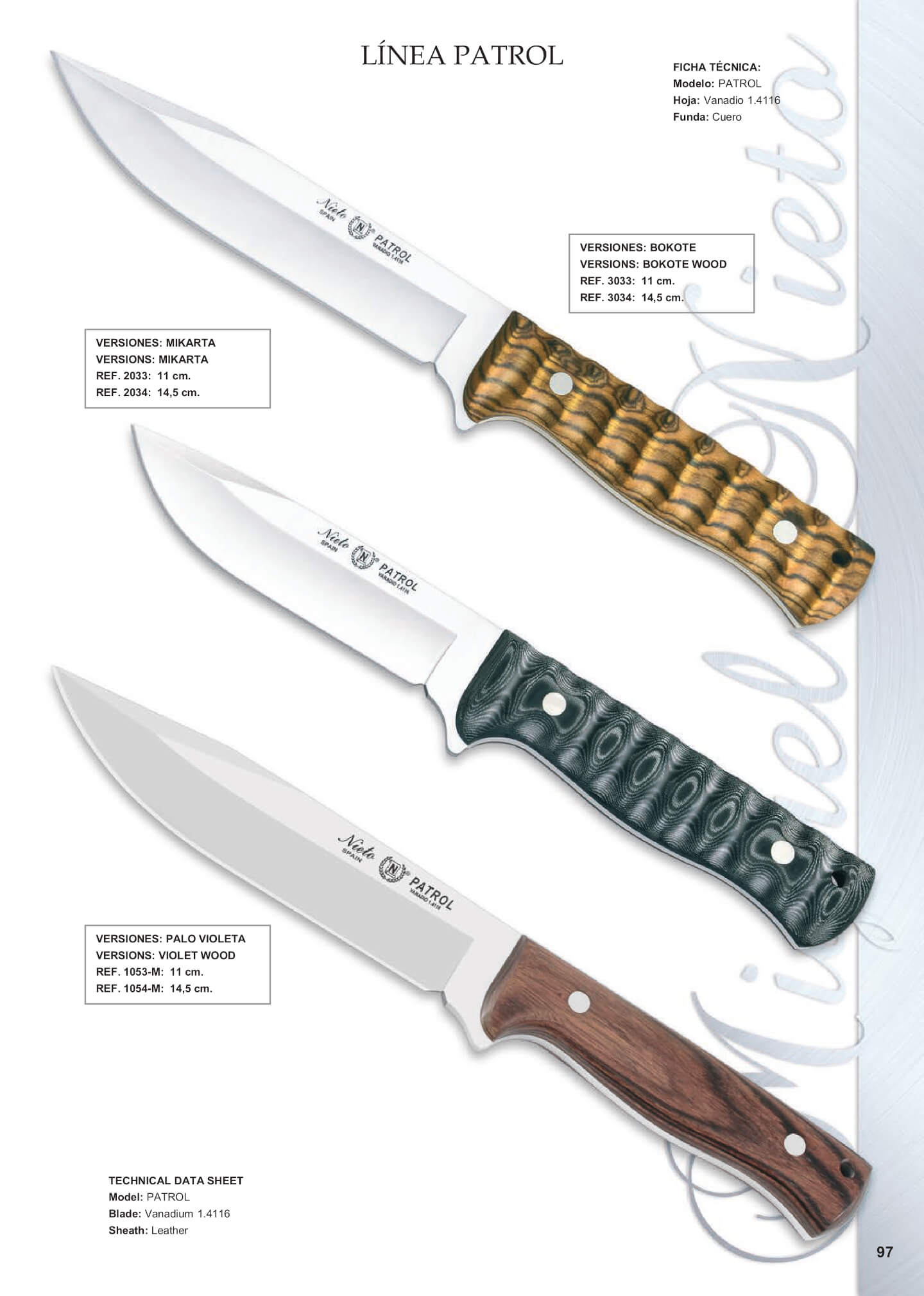 Lama: 14,5 cm. Lunghezza totale: 25 cm. Peso: 210 gr. Maniglia: Mikarta.