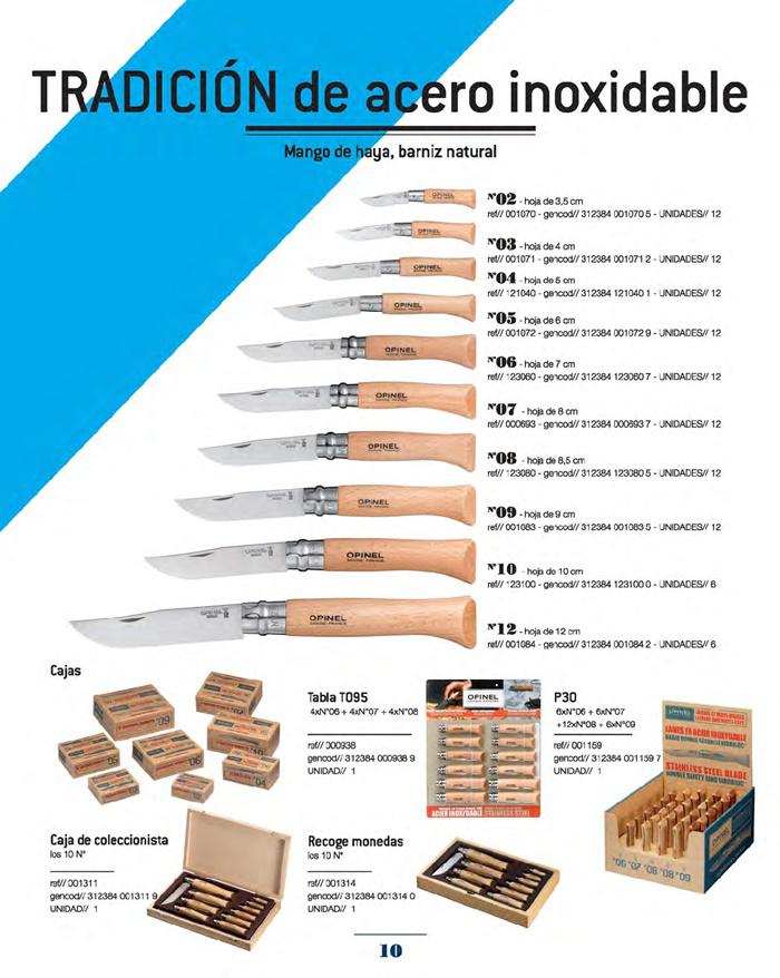 Coltelli Opinel, lama in acciaio inossidabile. Impugnatura in faggio verniciato.
