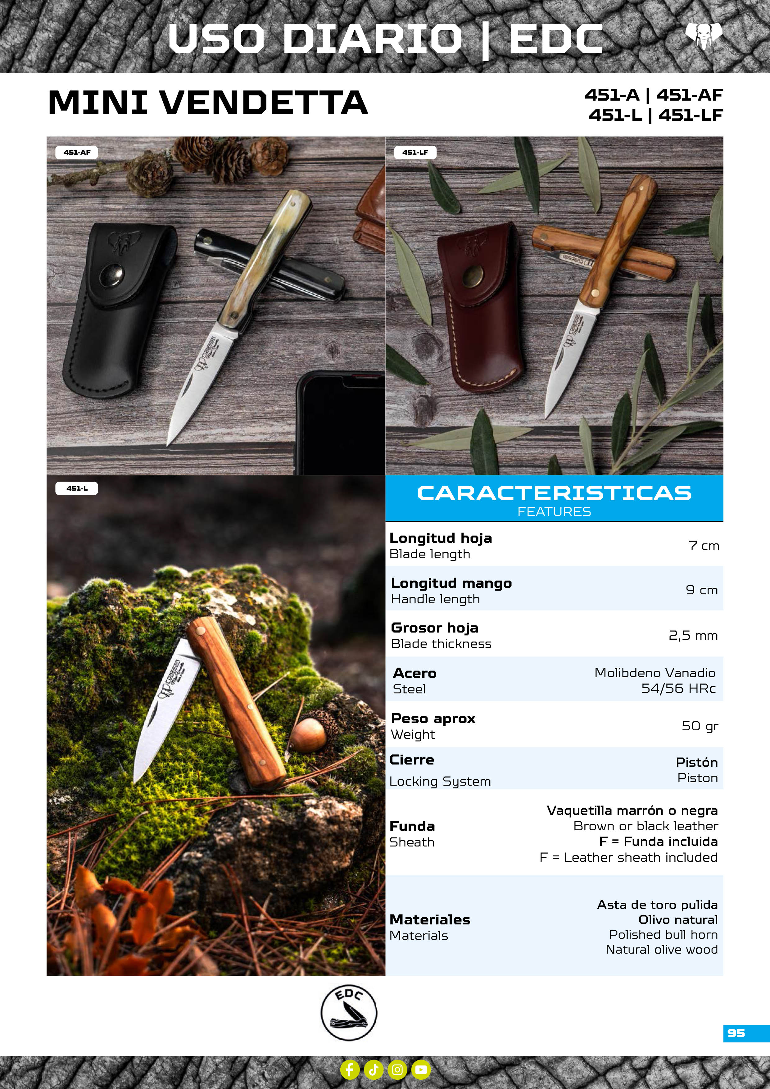 Coltelli da tasca in acciaio al vanadio al molibdeno con lama da 7 cm. Lunghezza totale: 16 cm. Spessore: 2,5 mm Larghezza pala: 1,5 cm. Guarnizione del pistone Puntali in acciaio A-304. Manici in legno di cocobolo, legno di ulivo o corno di toro.