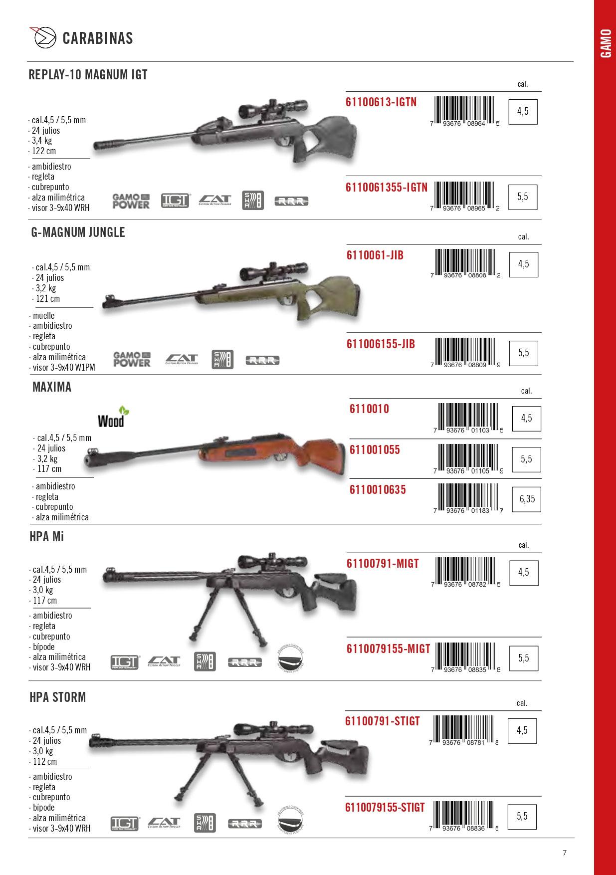 Cal. 4,5 oder 5,5 mm. 24 Joule. 3,4 kg. 122 cm. IGT. Rückstoßreduzierschiene. Reibungsloser Triger. Stoßwellenabsorver. 3-9X40WR Umfang enthalten.