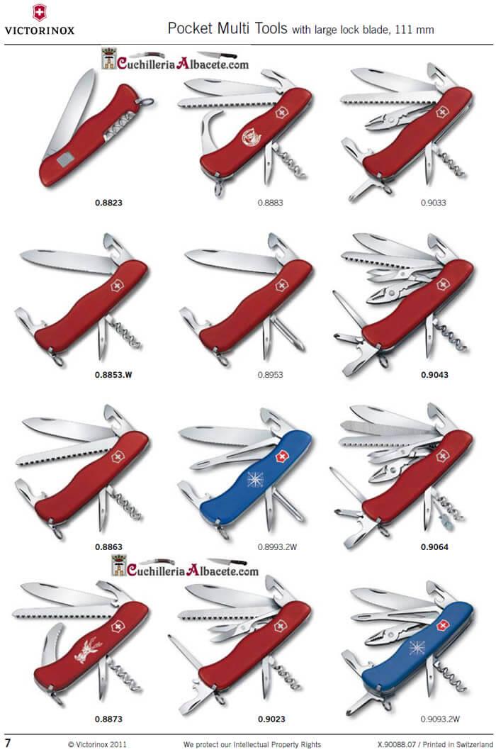 große Klinge, abschließbarer Flaschenöffner, Abisolierer, 7,5-mm-Schraubendreher, Dosenöffner, 3-mm-Schraubendreher, Reibahle, Korkenzieher, Pinzette, Zahnstocher, Ring.