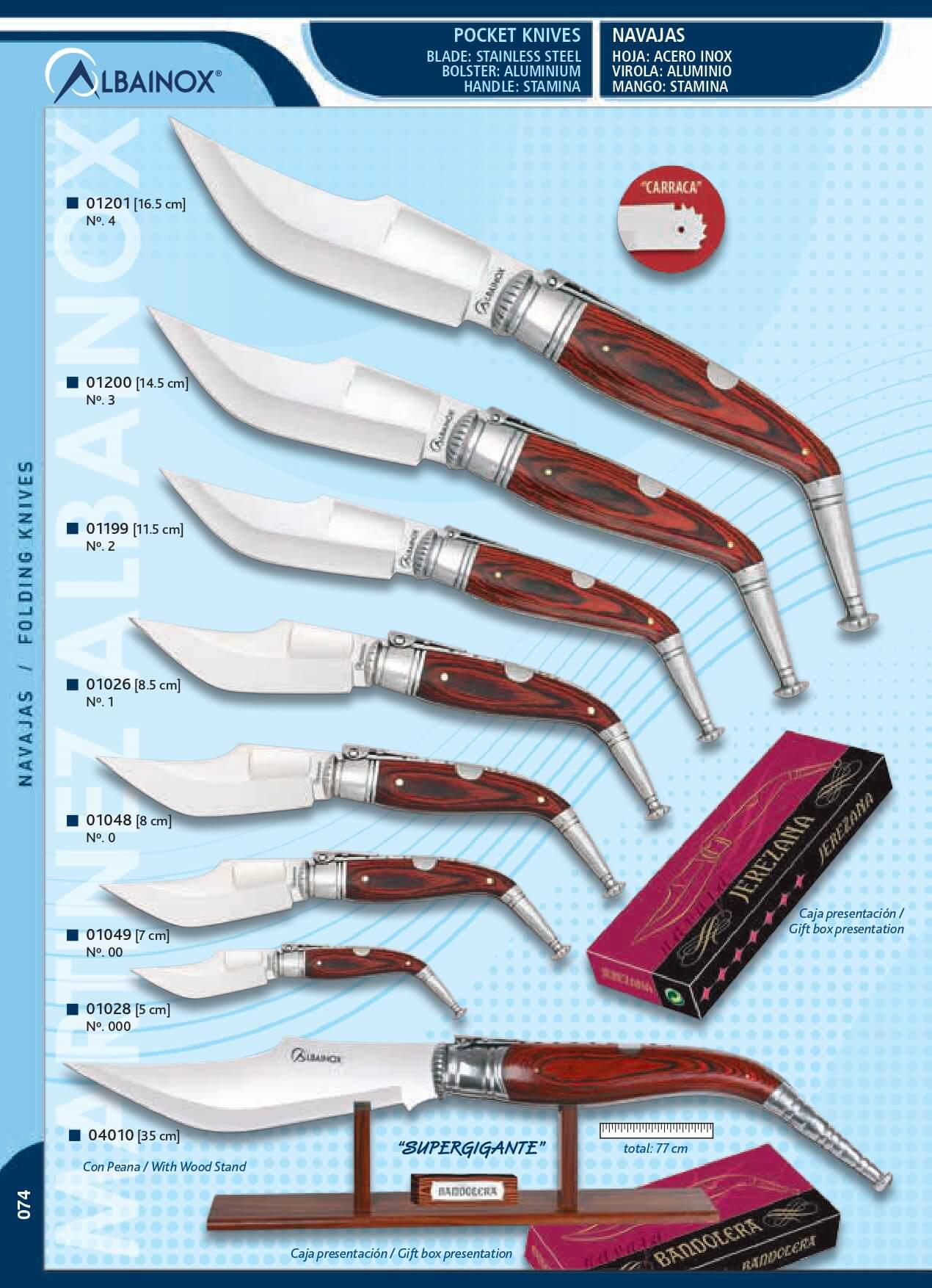 Klassischer "Carraca" Taschenmesser mit Edelstahlklinge (3Cr13Mov) in verschiedenen Größen. Ausdauergriff mit Stahlfutter. Palanquilla-Schloss (6 Federn). Aluminiumzwinge. Mit Präsentationsbox.