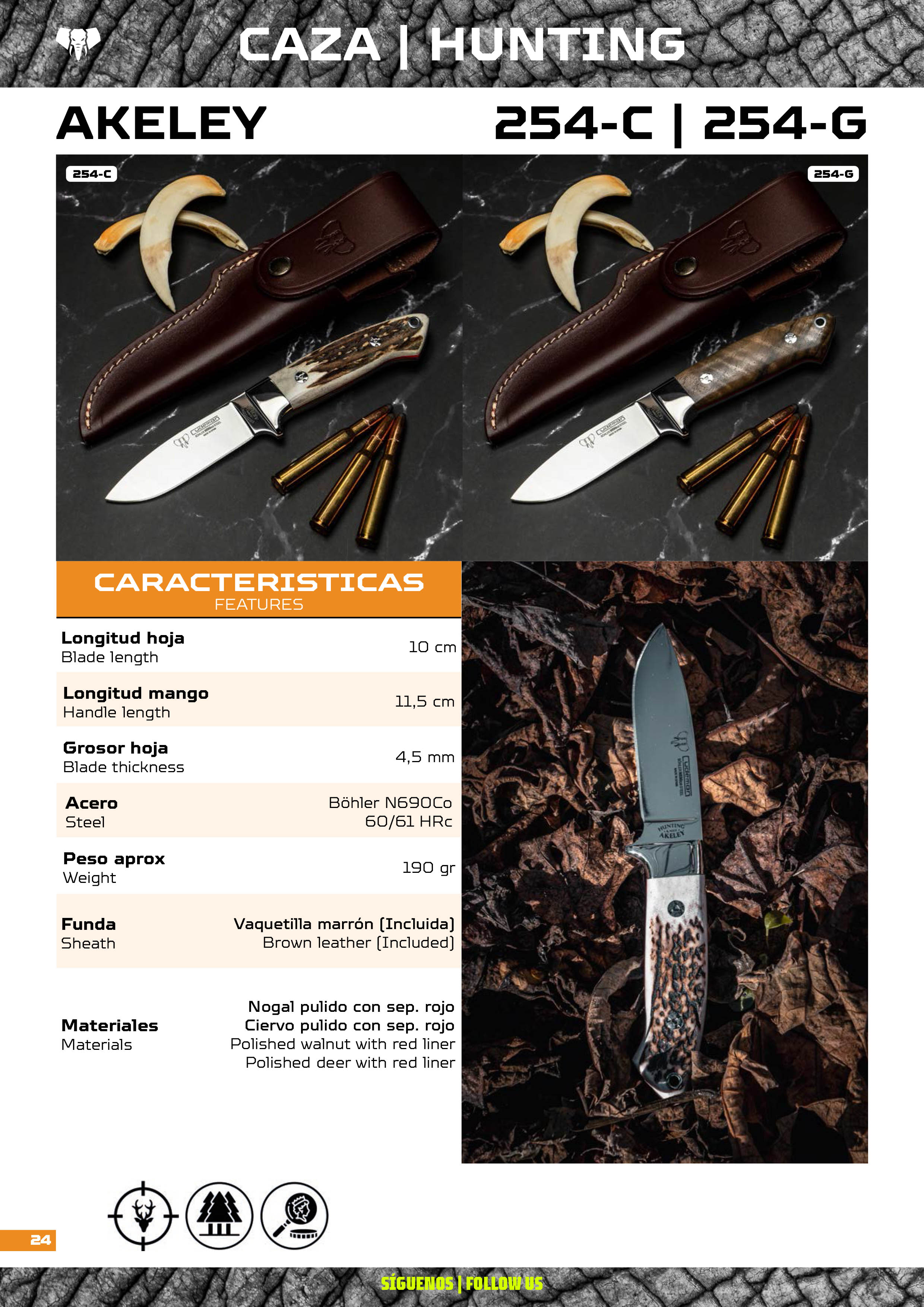 Jagdmesser Akeleys N690Co Böhler Stahl, Nussbaum oder Hirschhorngriff und Ledertasche enthalten.