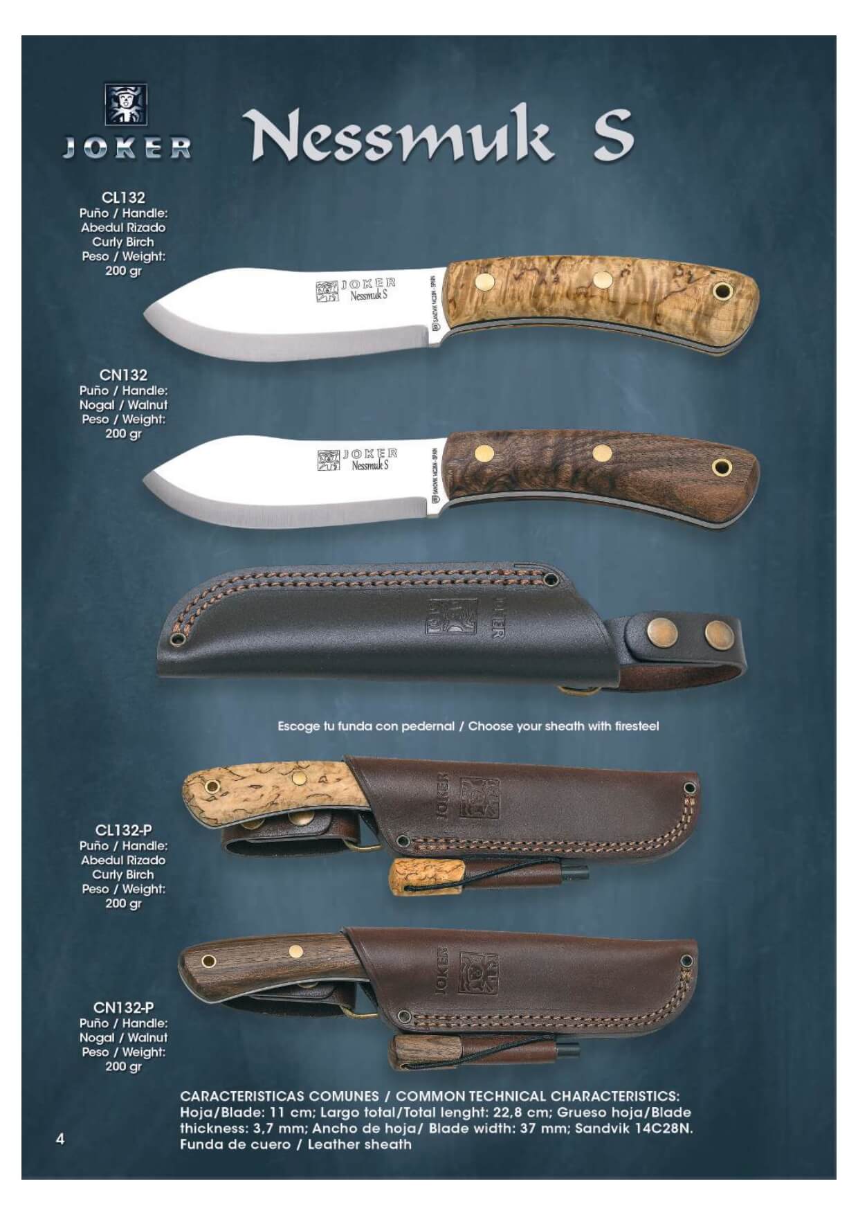 Joker Nessmuk Messer Bushcraft Messer mit Griffen aus Walnuss- oder Birkenholz. 11 cm Sandvick 14C28N Stahlklinge.