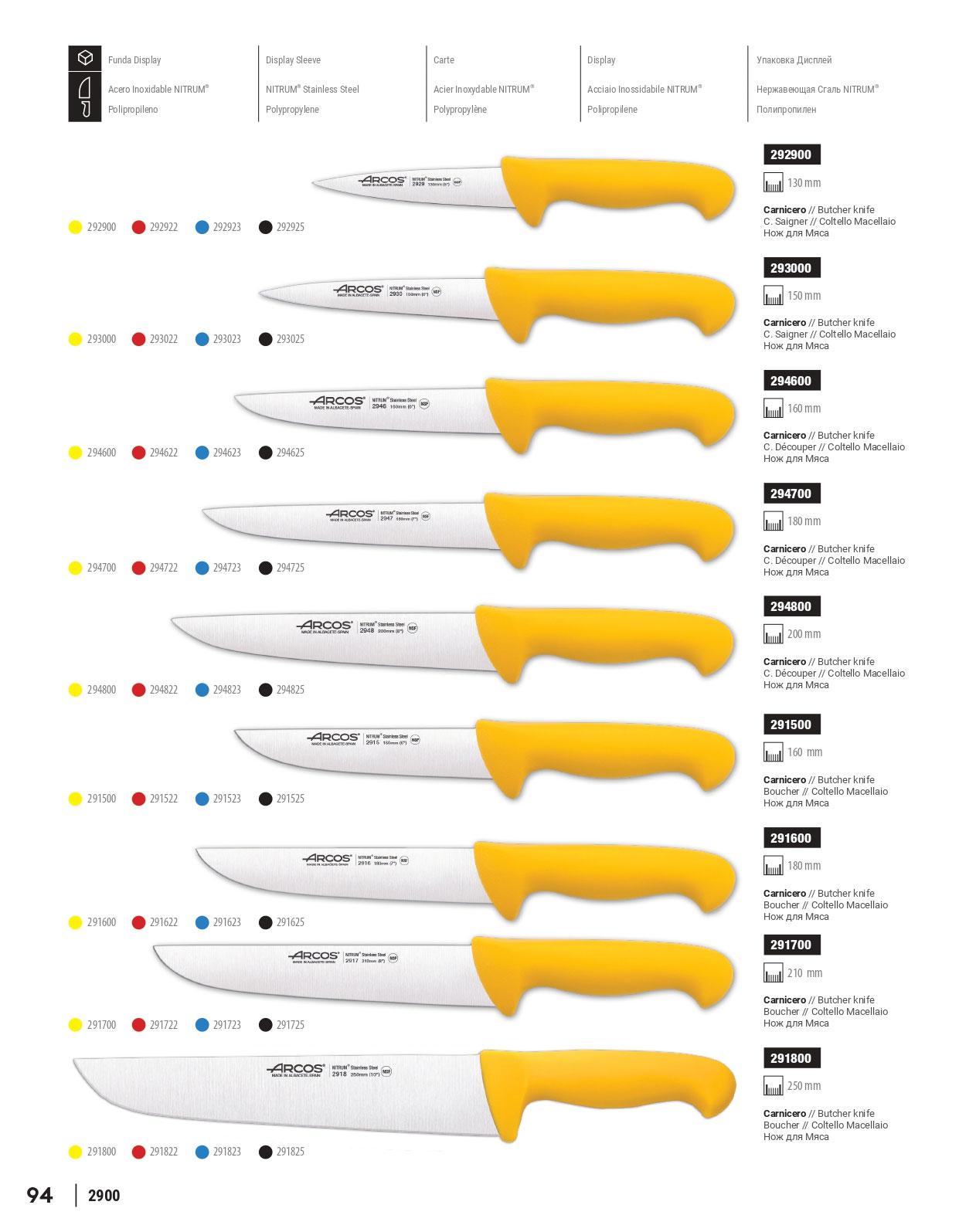 Metzgermesser mit widerstandsfähigen NITRUM Klingen aus rostfreiem Stahl. Eine Serie, die für Industrie-Profis, wirtschaftliche Messer, handlich, mit einer Vielzahl von Farben für eine bessere Organisation. Die Arcos 2900 Serie präsentiert eine breite Palette von Messern für Küche, Metzgerei, Konditorei, Fischerei...