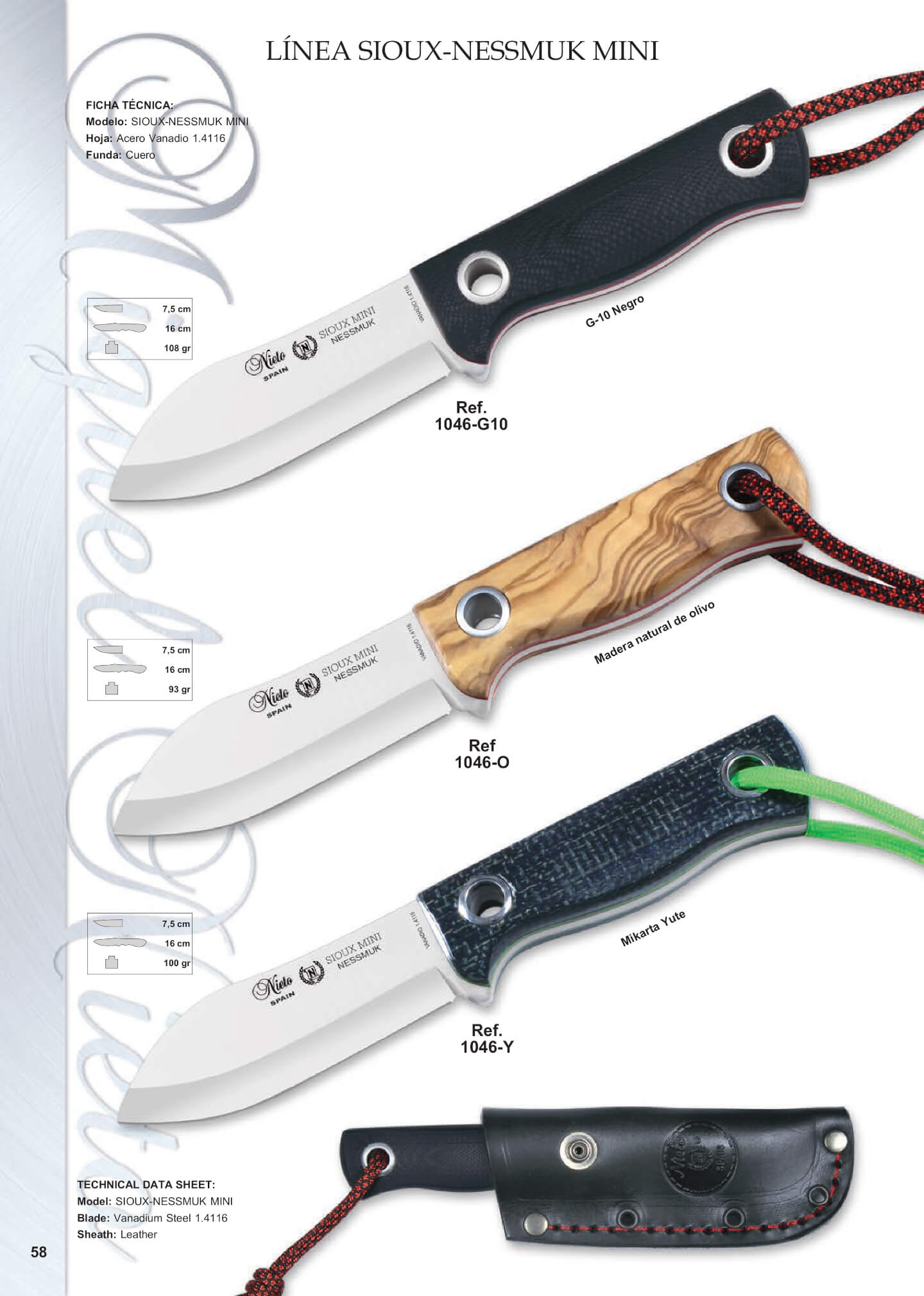 Neu Nieto Sioux Nessmuk Mini Jagdmesser, mit 7,5 cm Molybdän-Vanadium-Stahl Klinge und Lederscheide.