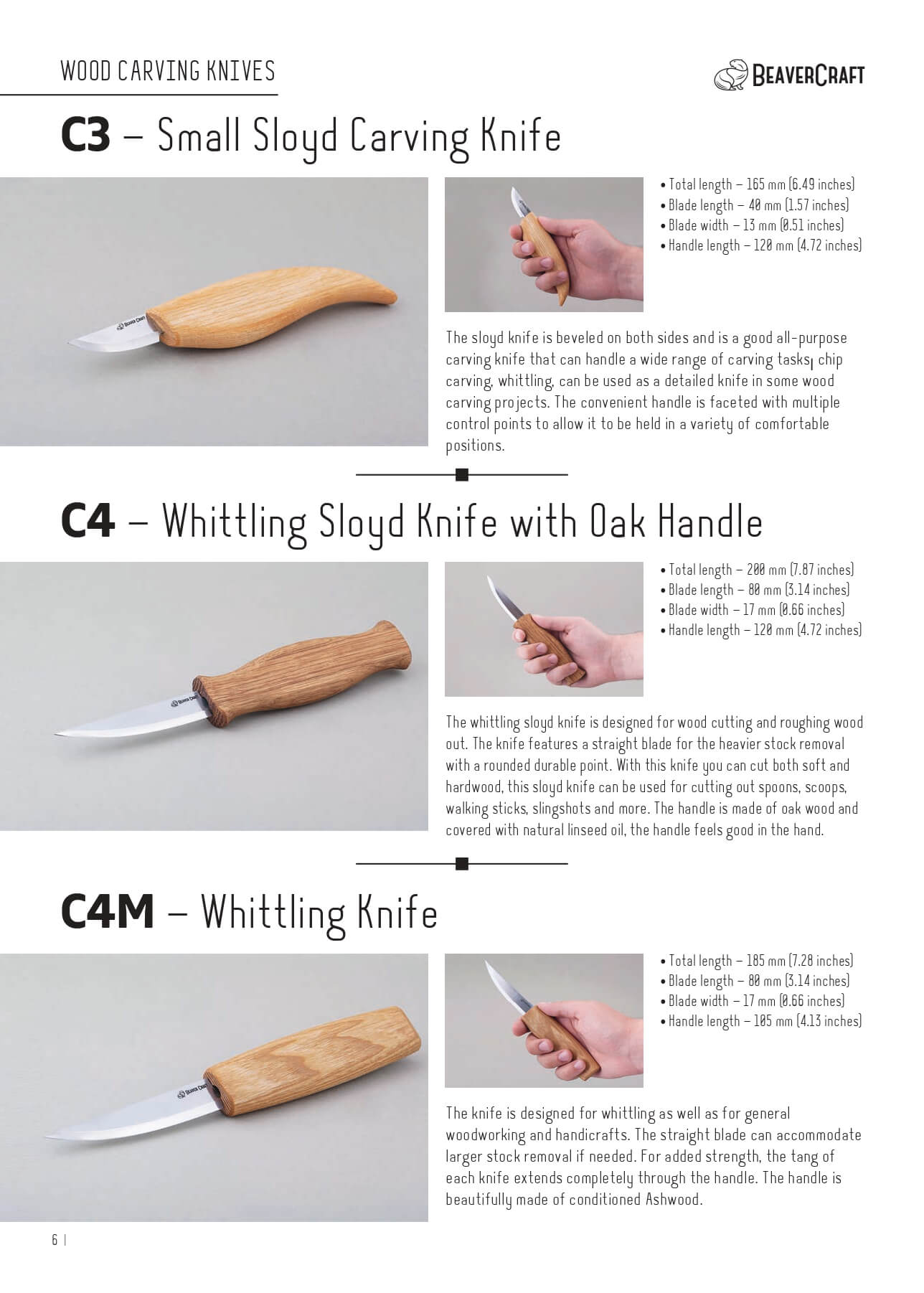 Schnitzmesser mit Klingen aus Kohlenstoffstahl und Griffen aus Esche und Eiche. Diese Messer sind für das Schnitzen kleinerer Teile, das Schnitzen größerer Flächen oder auch für das Schnitzen detaillierterer Bereiche geeignet. Diese Messer haben eine sehr starke Klinge und ihre Griffe ermöglichen es Ihnen, sie bequem aus verschiedenen Positionen zu halten.